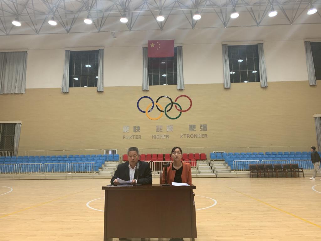 会上,副院长刘仁憨宣读了《m88 app庆祝学校60周年校庆活动实施方案》,副院长雍世仁宣读了关于校庆期间体育学院纪律规定,18级社体班学生李佳明同学做了表态发言。