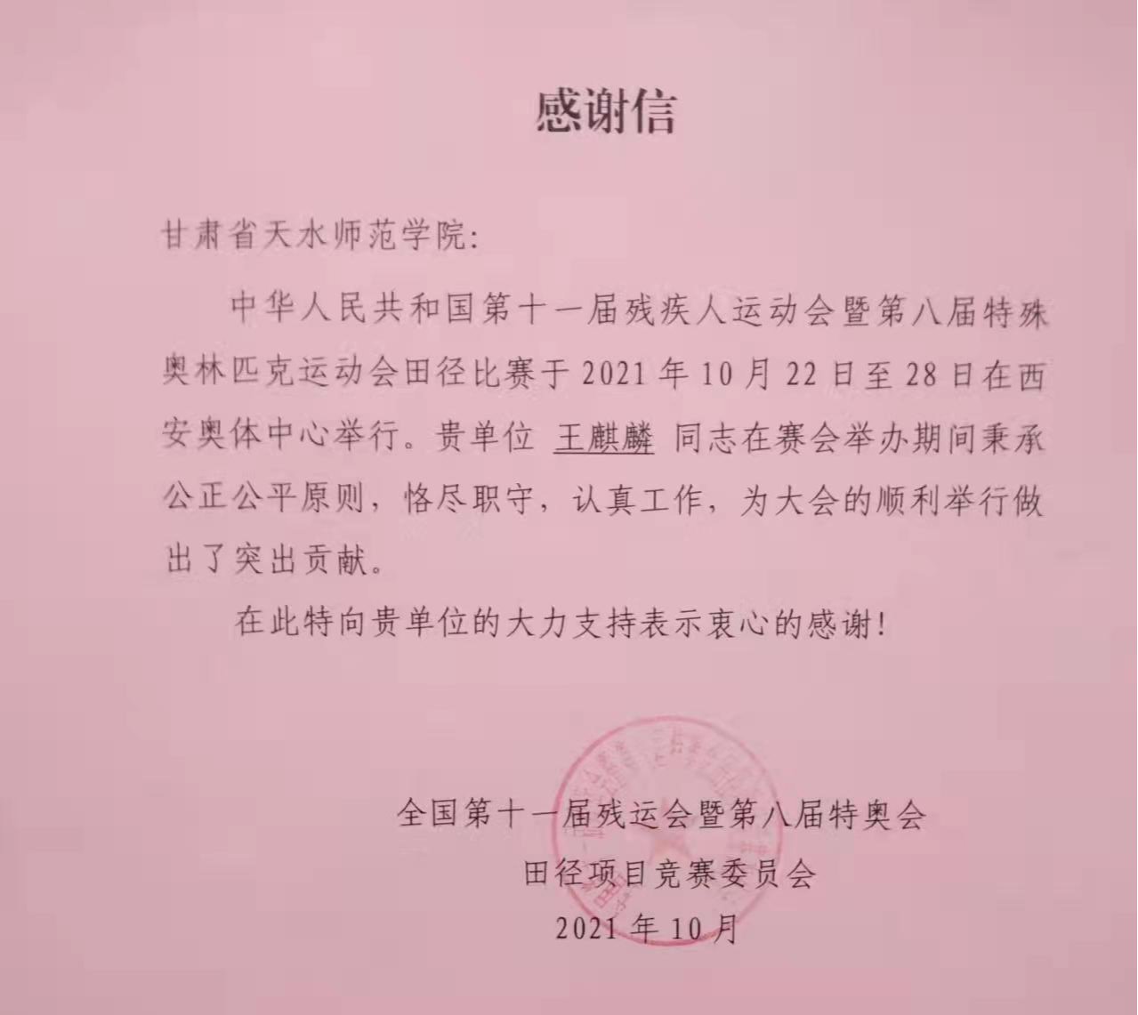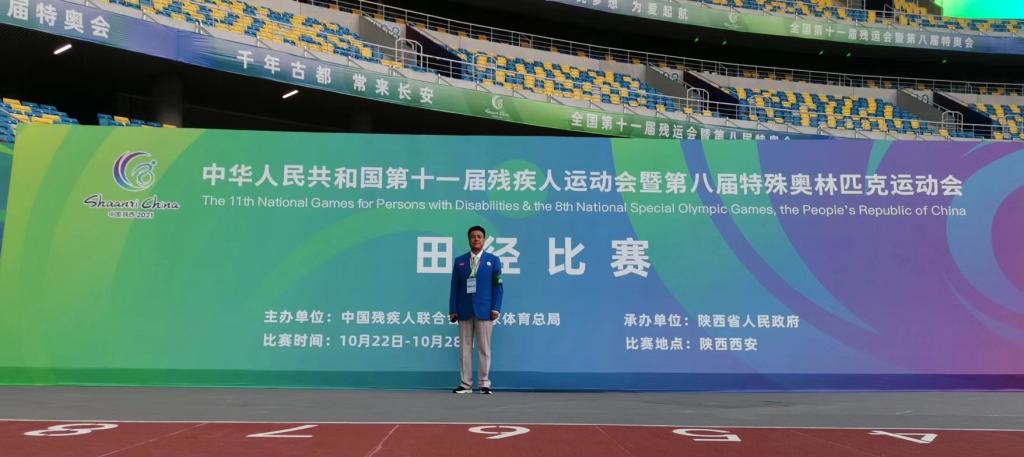 2021年10月22-28日,中华人民共和国第十一届残疾人运动会暨第八届特殊奥林匹克运动会田径比赛在西安奥体中心举行。我院特奥田径国家级裁判王麒麟教授受中残联和国家体育总局选派为田径项目技术官员,并担任田赛裁判长。