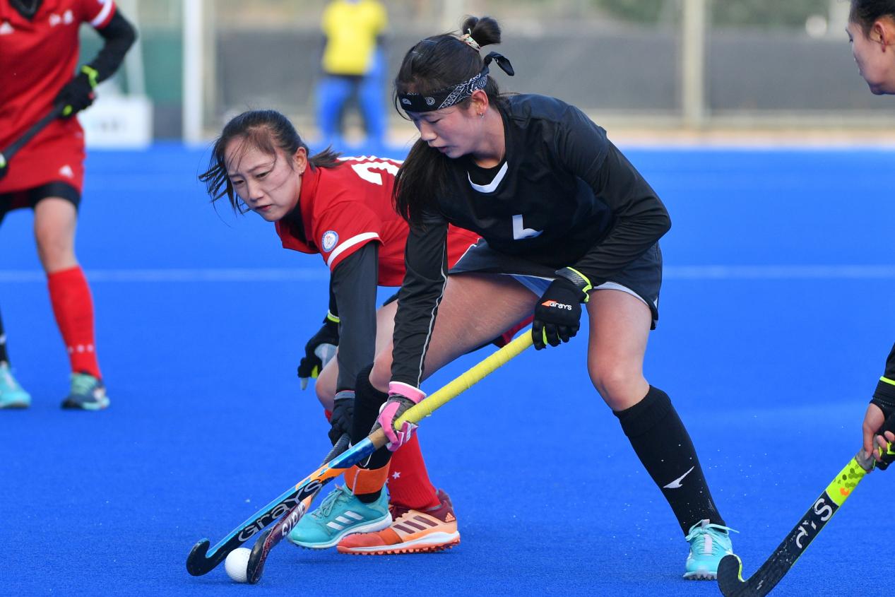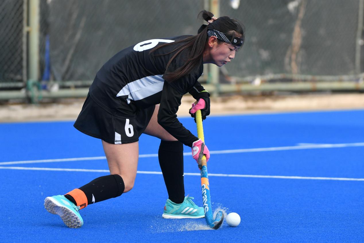 2022年在江苏常州全国青年女子曲棍球锦标赛中甘肃队袁明杰(左一)与江苏队队员在比赛中拼抢