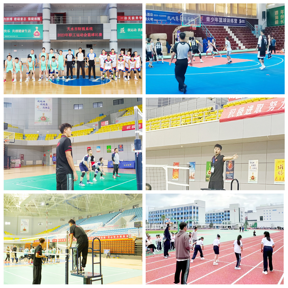 在天水市首届“花牛杯”篮球比赛中,学院选派1名教师和8名学生参与赛事活动,协助组织比赛,并承担比赛裁判任务;在天水市财税系统职工运动会中,学院选派1名老师和39名学生,担任气排球、篮球和羽毛球三个项目的裁判工作;在天水市实验小学校运会中,学院选派1名老师和30名学生,负责校运会所有项目的裁判工作;在天水市交通系统篮球赛中,学院选派1名老师和10名学生,承担比赛所有组织活动和裁判工作。