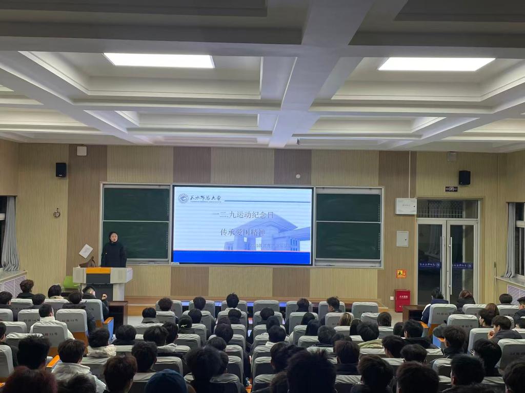 12月9日晚6:30,m88 app2025级全体学生在二教122阶梯教室齐聚一堂,召开以“一二·九运动纪念日:传承爱国精神”为主题的年级会议。会议由学院辅导员主持,210名学生全员参与,现场气氛庄重而热烈。